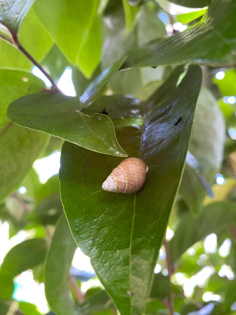 Cover of the Ecosystem Management Program Bulletin 2024 -2025 issue showcasing a kāhuli (Achatinella mustelina) resting on a hame (Antidesma platyphylla) leaf, at the Makaleha West snail predator proof exclosure.