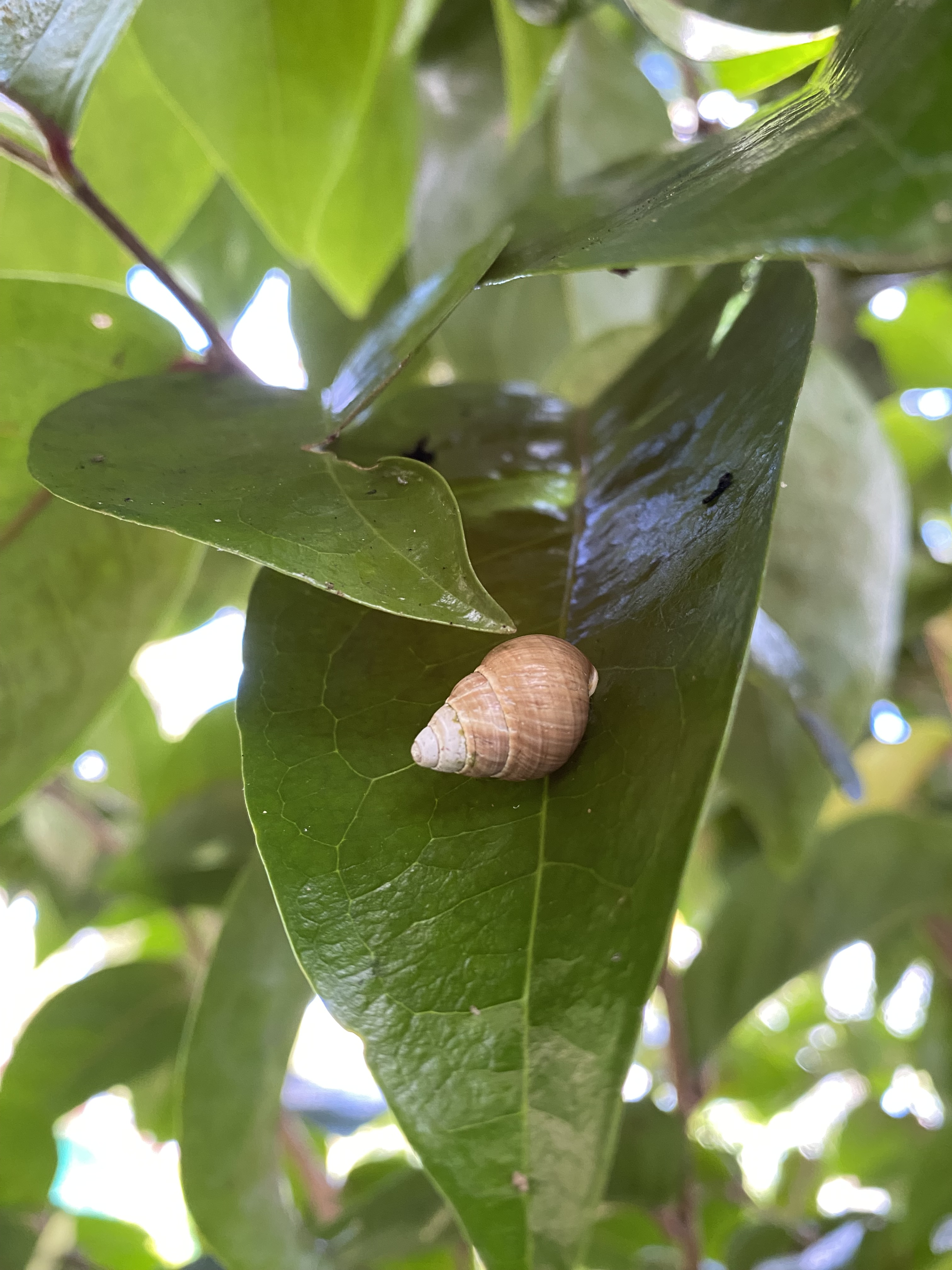 Cover of the Ecosystem Management Program Bulletin 2024 -2025 issue showcasing a kāhuli (Achatinella mustelina) resting on a hame (Antidesma platyphylla) leaf, at the Makaleha West snail predator proof exclosure.